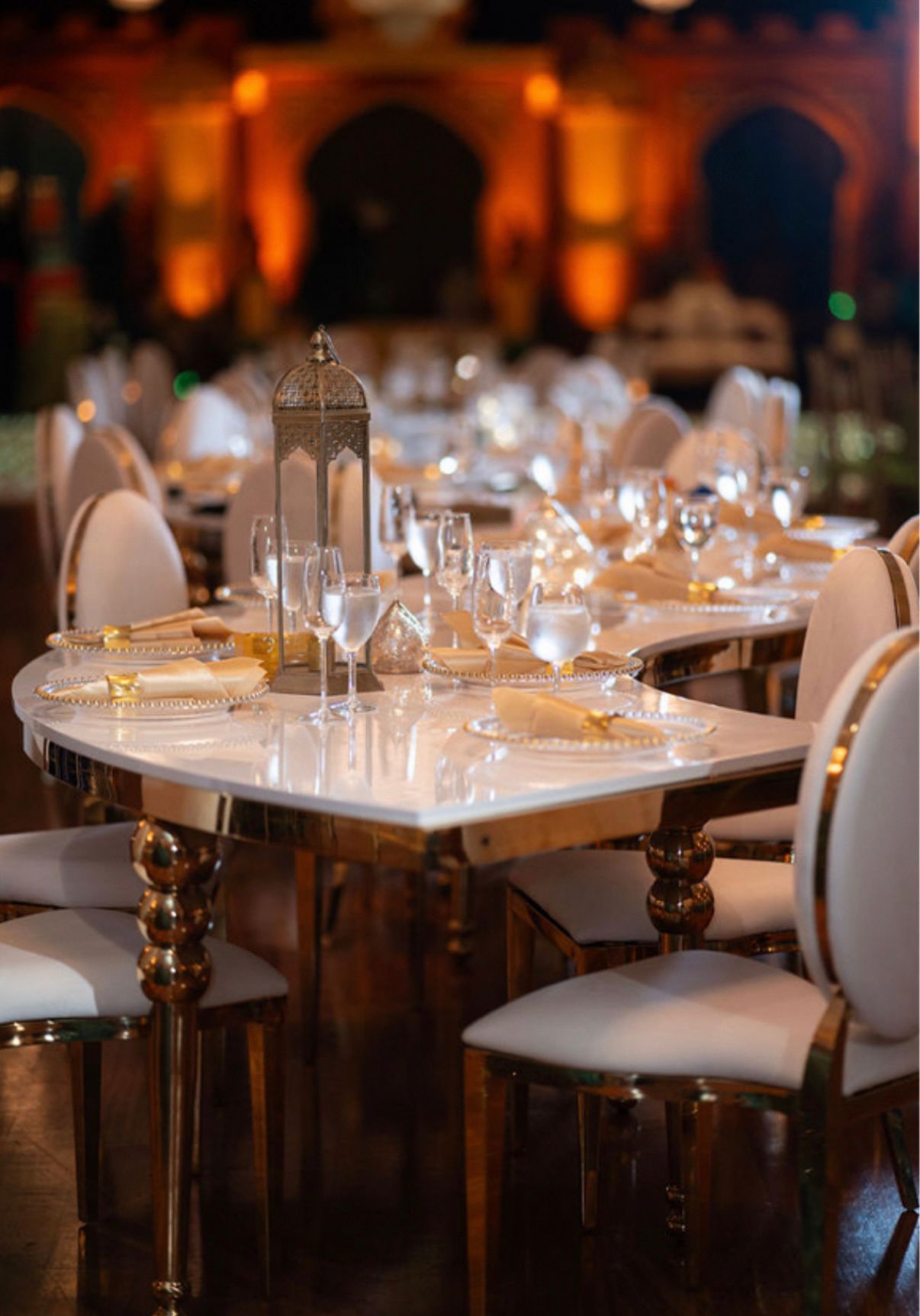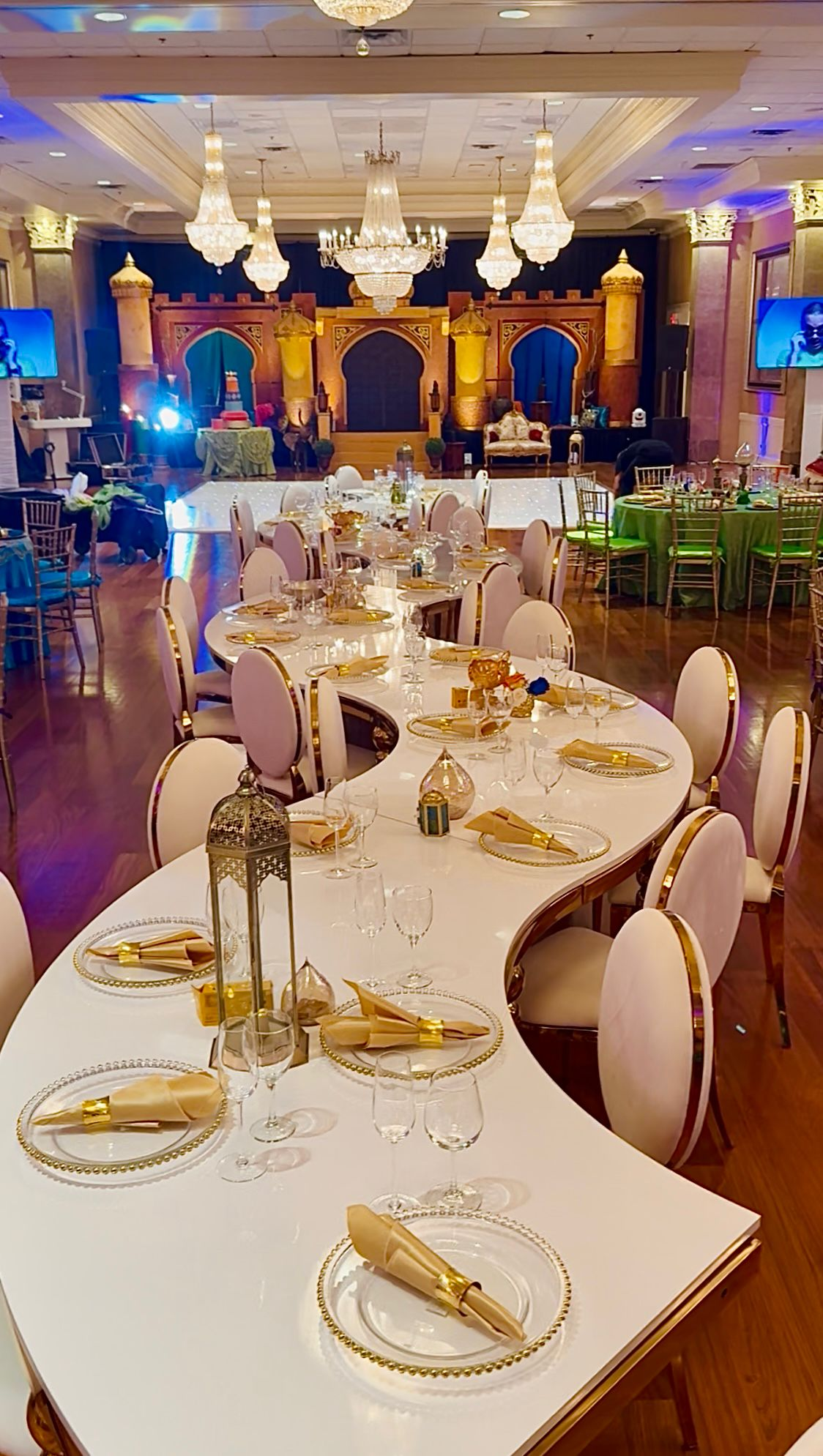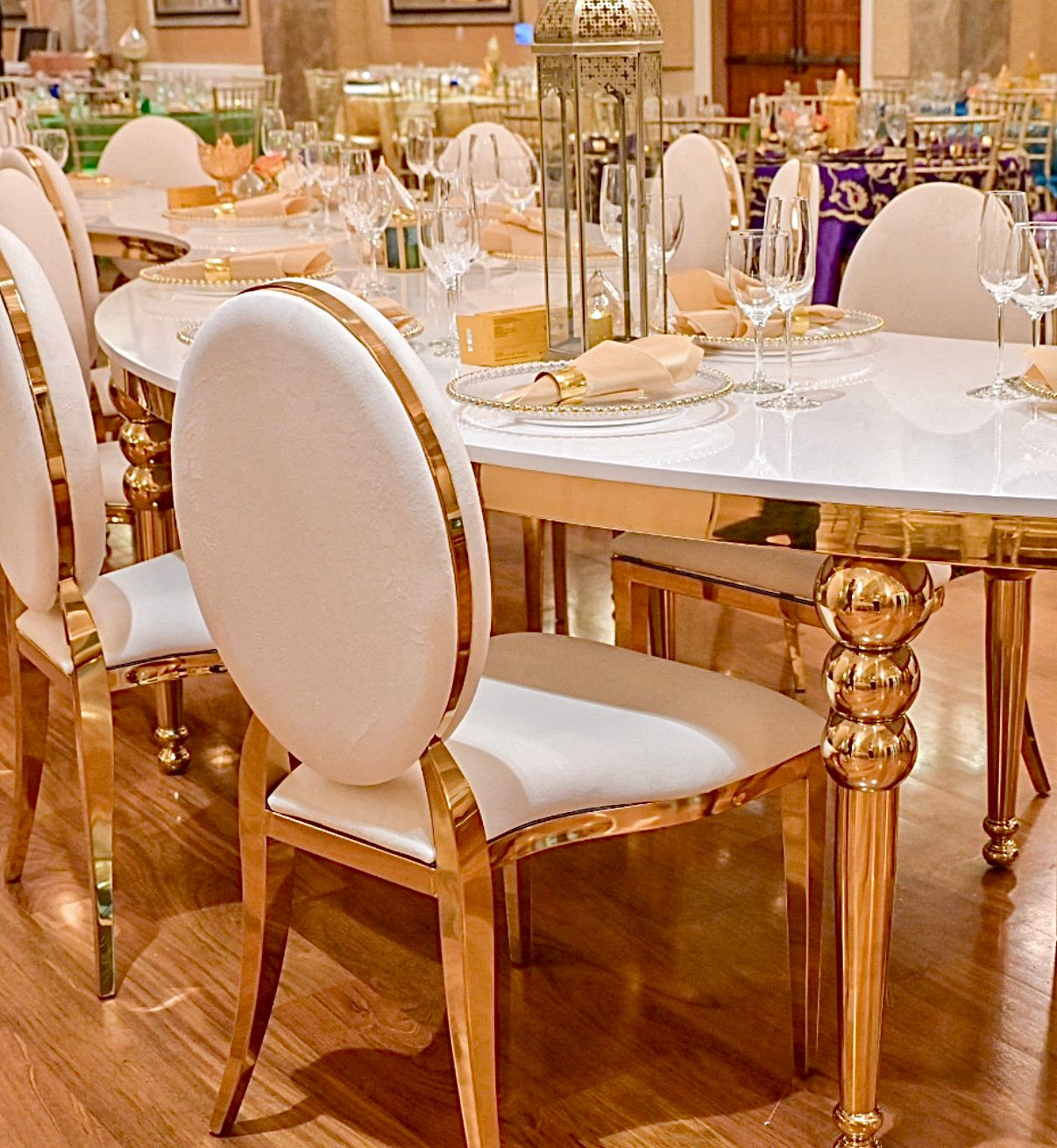 Our brand-new, pristine white-top serpentine tables with elegant gold metal legs are the epitome of event luxury. These rare, designer pieces aren’t available just anywhere—and certainly not at our prices. Delivered and installed by our professional setup team, they pair perfectly with our gold-trimmed white chairs for a flawless look. Ideal for weddings, galas, Quinceañera, and upscale celebrations in Miami-Dade and Broward. No competition. No comparison