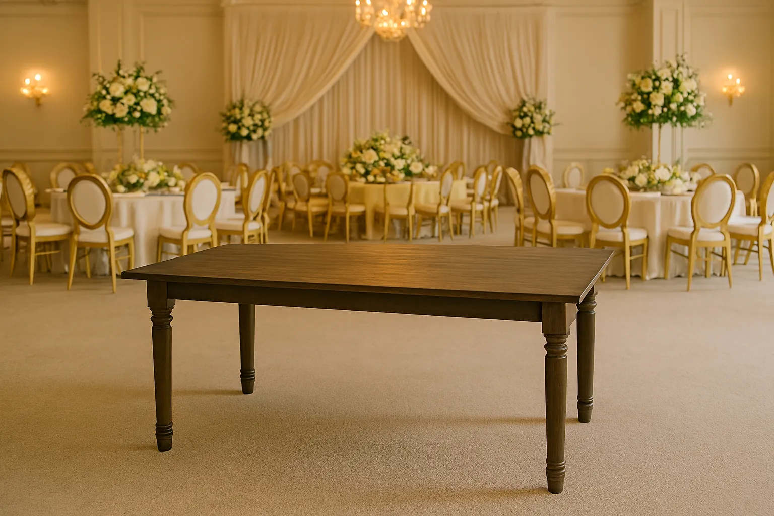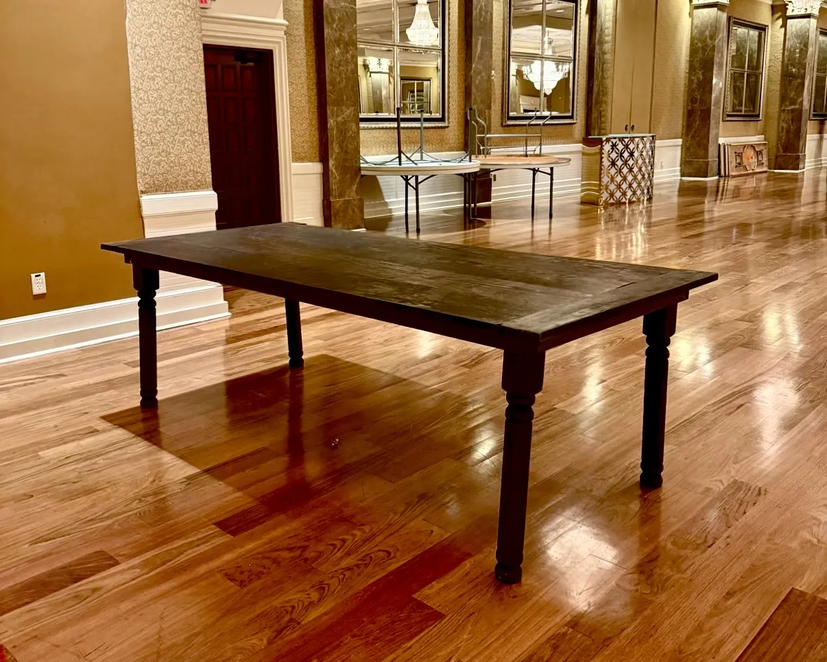 Handcrafted 8ft x 4ft wooden farm table is the perfect centerpiece for weddings, quinceañeras, corporate events, and private celebrations. Its rich wood finish and classic farmhouse design bring warmth and elegance to any setting, whether indoors or outdoors.